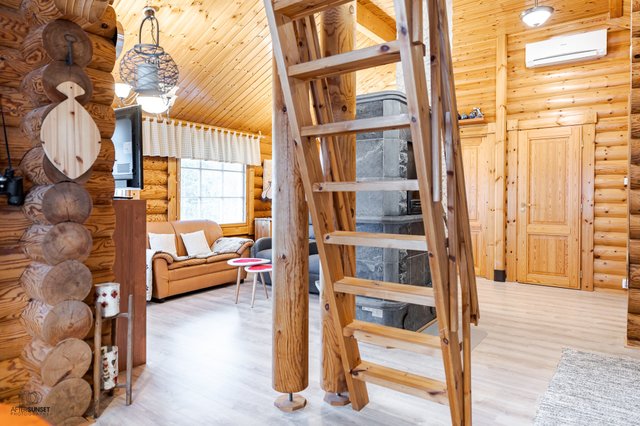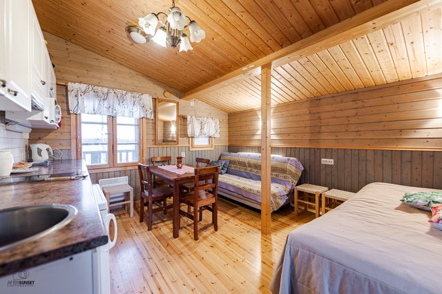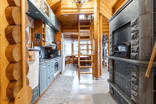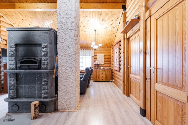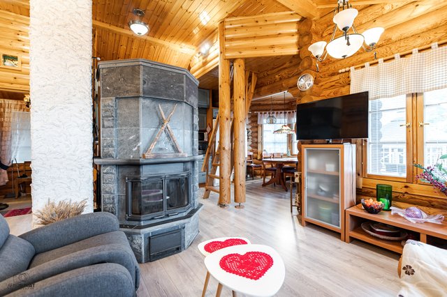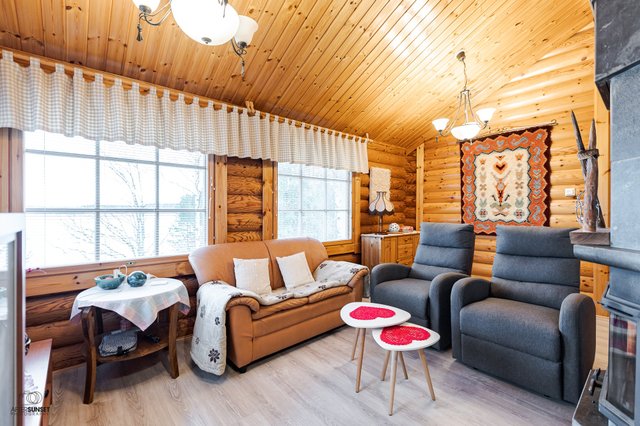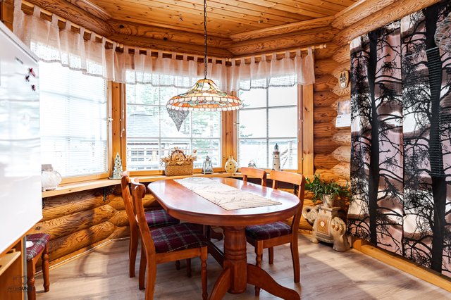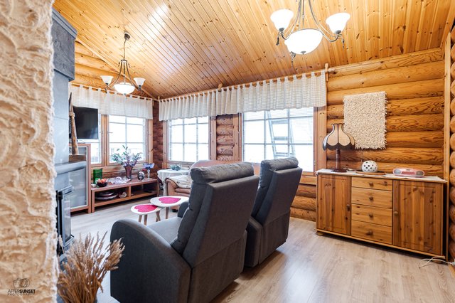 - Olohuone/tupa yhtenäistä tilaa keittiön ja ruokailutilan kanssa. Lattiassa laminaatti, seinät hirttä.