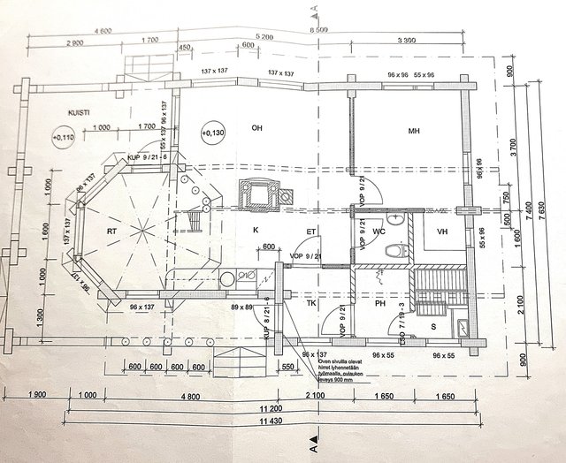 K, tupa, mh, parvihuone, vh, kph, et, terassi.
