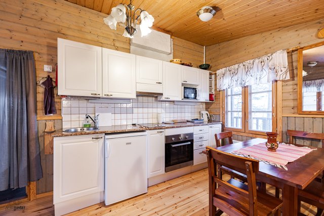 - Jääkaappi/pakastin, astianpesukone, liesituuletin , keraaminen liesi, uuni, leivinuuni. Lattia laminaattia.