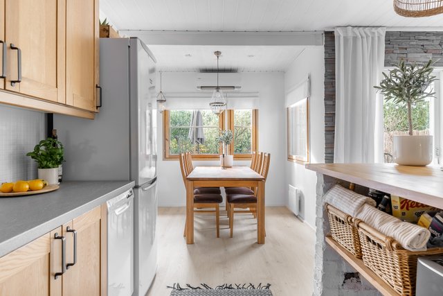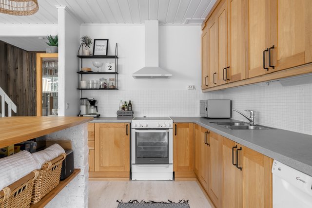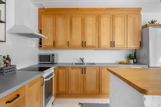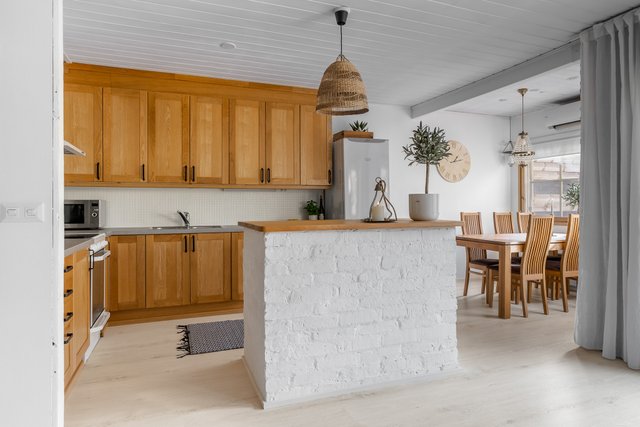 - Jääkaappipakastin, uuni, liesi, liesituuletin (Uusittu 2025), mikroaaltouuni, astianpesukone, ja keittiösaareke