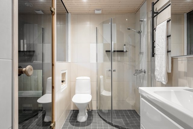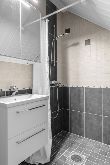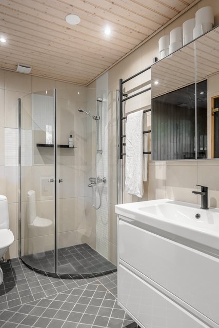 - WC-istuin, suihku, lattialämmitys, peilikaappi, peili, pesuallas, ja allaskaappi