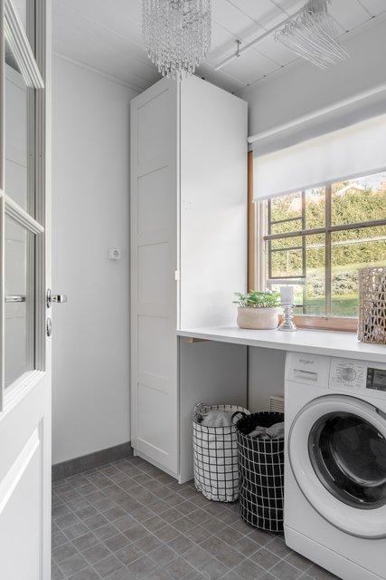 - Pesukoneliitäntä, pyykkikaapit, pöytätaso, ja tila pesutornille