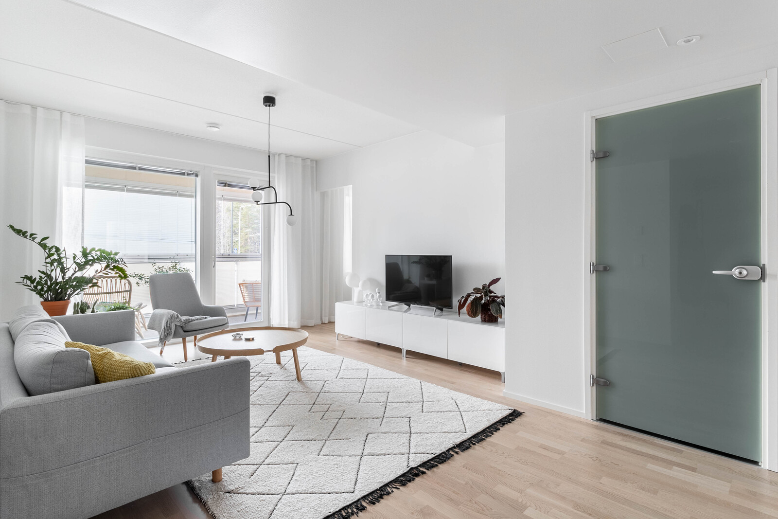 Asunnon tilavasta olohuoneesta avautuu käynti suurelle lasitetulle parvekkeelle – täydellinen paikka nauttia aamukahvista ja syksyn rauhallisista hetkistä. Keittiö on kotikokin unelma: vaaleat kaapistot, modernit kodinkoneet ja runsaasti tilaa luovuuden virtaamiseen ruoanlaiton parissa. Kaksi makuuhuonetta tarjoavat rauhalliset puitteet rentouttavaan uneen, ja molemmissa on käytännölliset liukuovikaapistot, jotka tuovat runsaasti säilytystilaa arkeen.