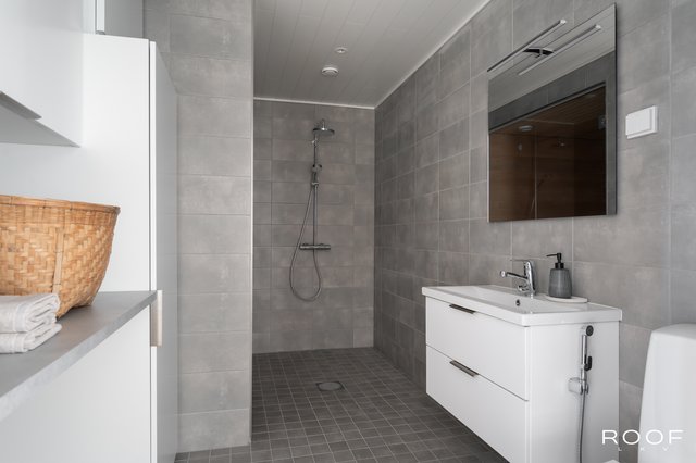 - Sadesuihku, wc-istuin, pesukoneliitäntä, allaskaappi, pyykkikaappi, halogeenivalot