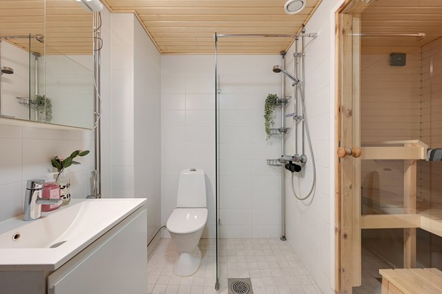 Kylpyhuone on toimiva ja hyvin suunniteltu kokonaisuus, johon mahtuu kaikki tarpeellinen – myös pesutorni. Oman saunan löylyt kruunaavat päivän ja tuovat rentouttavaa luksusta arkeen.