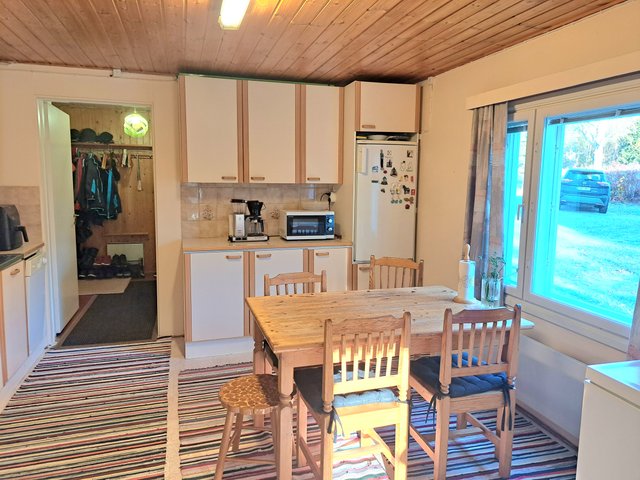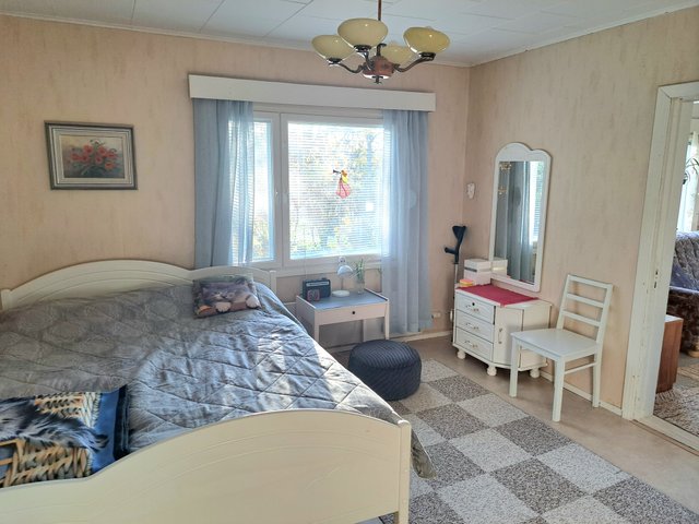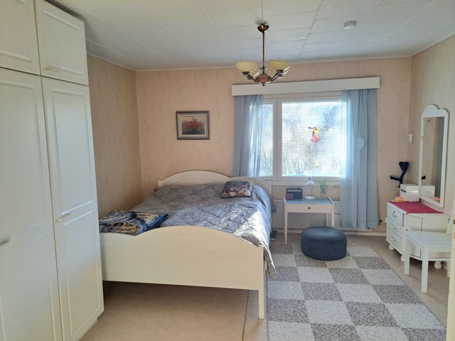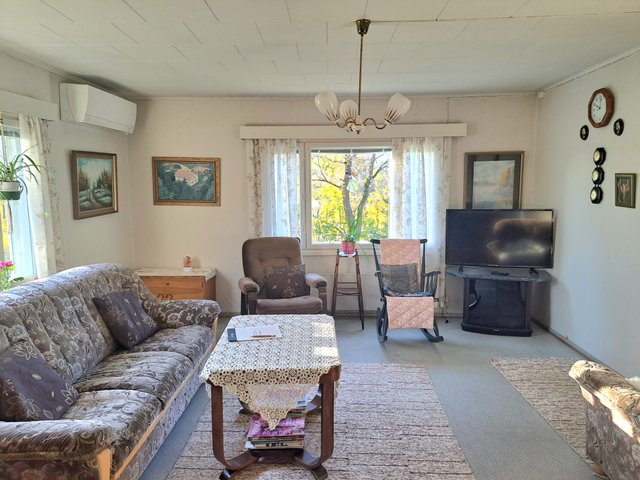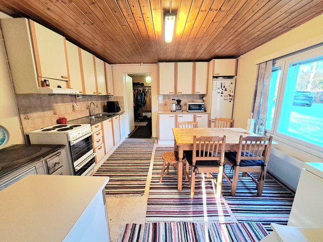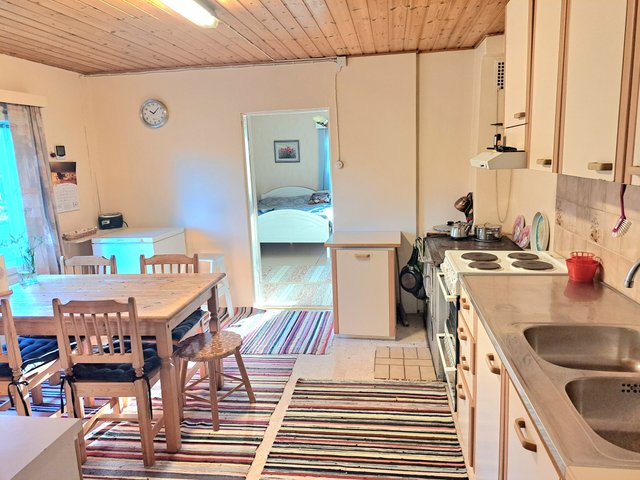 Talossa on kaksi makuuhuonetta, joissa on tapetoidut seinät ja muovimatot. Olohuoneessa on tilaa perheen yhteisiin hetkiin, ja keittiöstä löytyy sekä sähkö- että puuhella, mikä tuo perinteistä tunnelmaa ruoanlaittoon. Ulkorakennuksessa sijaitseva sauna tarjoaa rentouttavia hetkiä puukiukaan lämmössä.