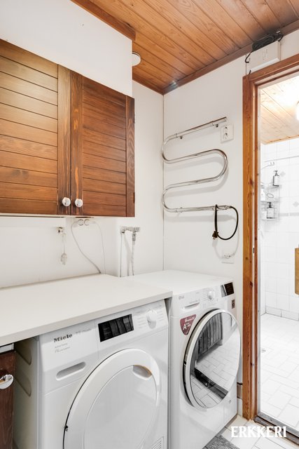 - Kylpyhuone omalla saunalla. Kylpyhuoneesta on käynti etupihalle. Kylpyhuoneen yhteydessä erillinen kodinhoitohuone. Saunassa ikkuna. Alakerrassa erillinen wc.