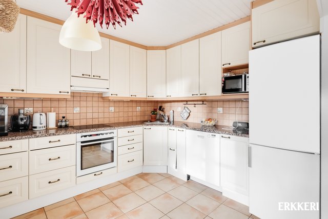 - Tilava olohuone, mistä käynti isolle omalle aidatulle pihalle. Keittiö ja olohuohuone muodostavat viihtyisän kodin sydämmen