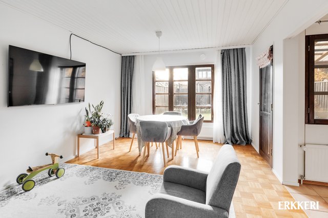 Alakerta: Oh, k, kph ja s, erill. wc ja iso aidattu piha. Yläkerrassa 2 mh, vh, erill. wc ja parveke.
