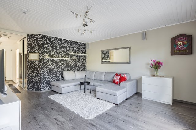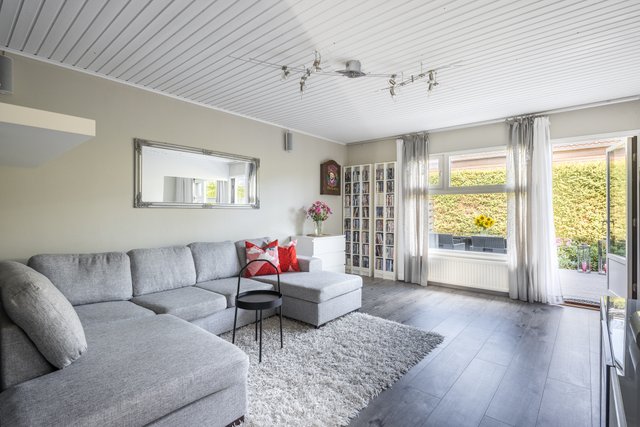 - Tilava, valoisa olohuone, josta kulku aidatulle terassipihalle.