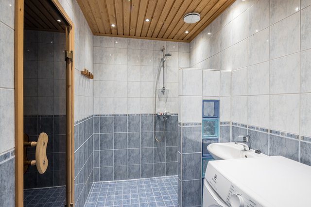 - Suihku, lattialämmitys, pesukoneliitäntä, pesuallas, allaskaappi, ja peili