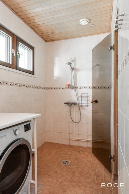 - Lattialämmitys, pesukoneliitäntä, pyyheteline ja suihku. Lattiat on laattaa ja seinät kaakeloitu