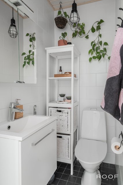 - VARUSTUS: Wc-istuin, bideesuihku, pystykaappi, allaskaappi ja peilikaappi. LATTIA: Laatta SEINÄT: Laatta