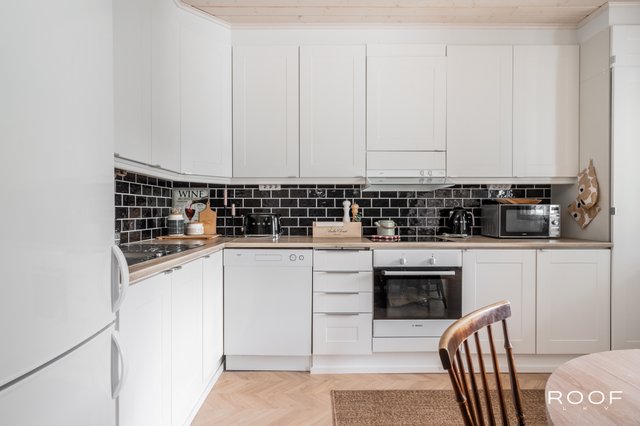 - VARUSTUS: Keraaminen liesitaso, erillisuuni, jääkaappi/pakastin-yhdistelmä, liesituuletin ja astianpesukone. SEINÄT: Maali LATTIA: Laminaatti
