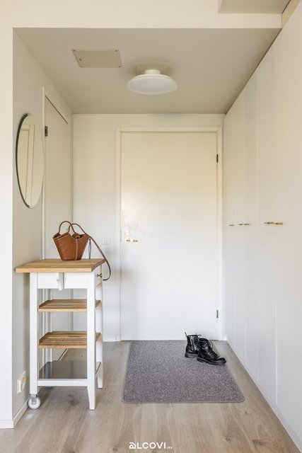 - Eteisen lattia on laminaattia, seinät maalatut. Kiintokaapistot. Vaatehuoneen lattia on laminaattia, seinät maalatut. Avohyllyä, tankoa.