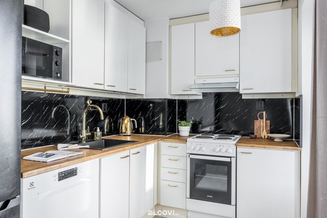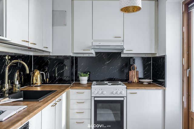 - Avokeittiön varustukseen kuuluu liesi, liesituuletin, jääkaappi-pakastin ja astianpesukone. Työtaso on massiivipuuta, välitila marmorikuvioitua komposiittia ja yläkaappien alla on led-valaistus. Käynti terassille.