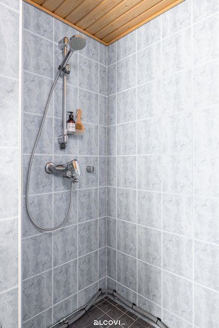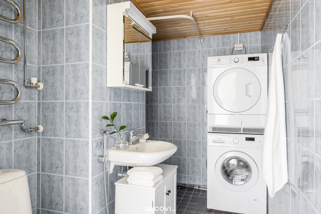 - Kylpyhuoneen varustukseen kuuluu allas- ja peilikaappi, suihku, tilavaraus pesutornille, pyyhekoukut, rättipatteri ja wc-istuin. Lattia on laattaa, seinät kaakelia ja katto paneloitu.