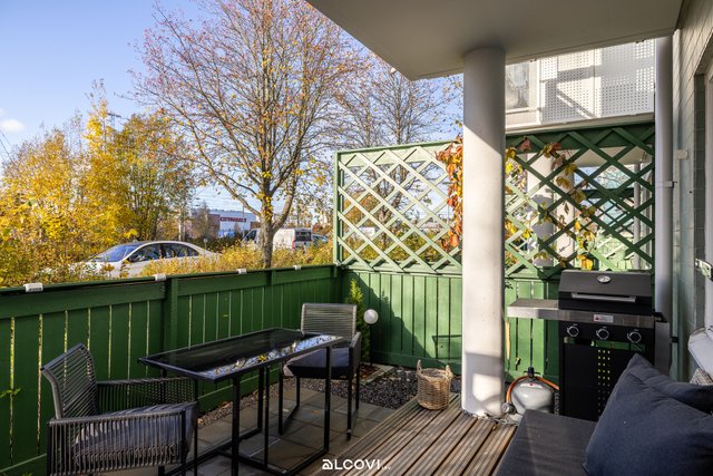 - Katettu terassi, jonka yhteydessä aidattu, pieni piha. Piha-alue on taloyhtiön hallinnassa; ei yhtiöjärjestyksessä merkitty osakaspihaksi.