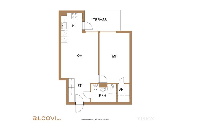 Vaaleat pinnat kera isojen ikkunoiden luovat mukavasti tilantuntua asuinhuoneisiin. Avokeittiö on varusteltu kaikilla kaipaamillasi toiminnallisuuksilla, ja puiset työtasot yhdessä marmorikuvioidun välitilan viimeistelevät tyylikkään yleisilmeen. Olohuoneeseen sopii vaivatta ruokailuryhmä yhdessä tavanomaisen sohvakalustuksen kanssa. Tilava makuuhuone tarjoaa paikan työpisteelle, ja vaatehuone täydentää säilytysratkaisut. Kylpyhuoneessa hoituvat niin peseytyminen kuin pyykkihuoltokin. Katettu terassi ja aidattu piha-alue tarjoavat viihtyisän paikan vaikkapa ilta-auringosta nauttimiseen.