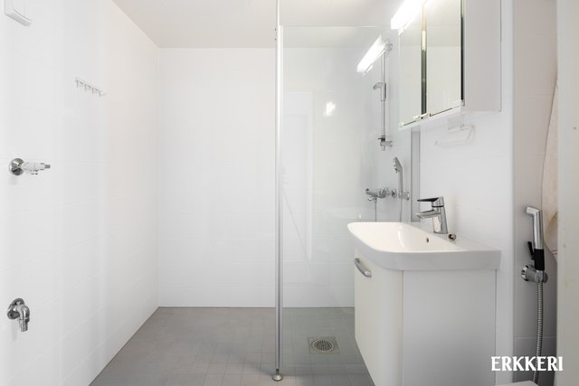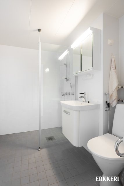 - WC-istuin, suihku, suihkuseinä, pesuallas, peilikaappi, allaskaappi, bidee-suihku, ja pesukoneliitäntä