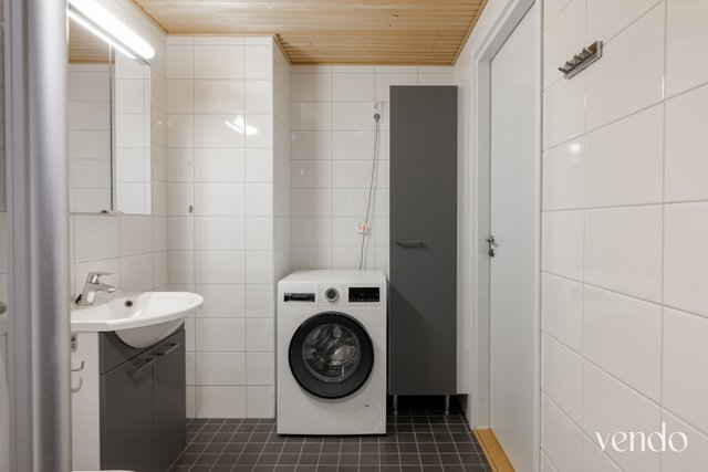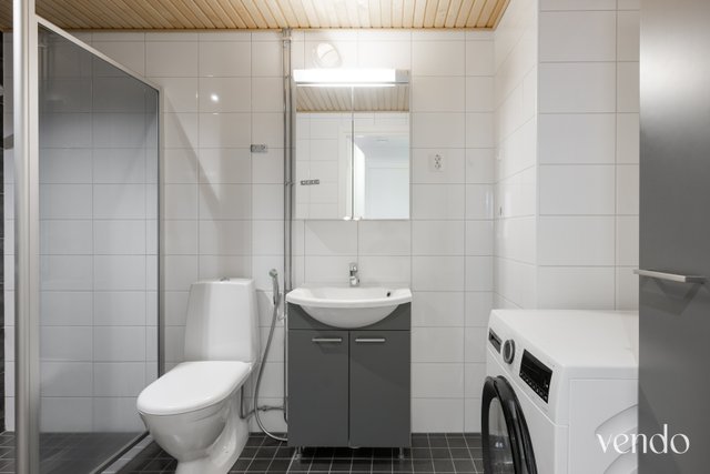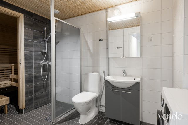 - WC-istuin, suihku, pesukoneliitäntä, lattialämmitys, peilikaappi, bidee-suihku, ja allaskaappi