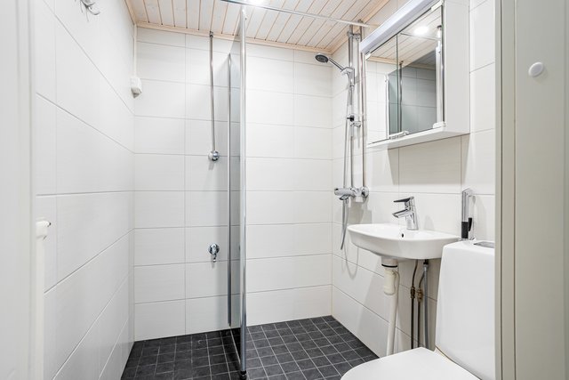 - Bidee-suihku, wc-istuin, pesukoneliitäntä, peilikaappi, lattialämmitys, suihkuseinä, ja suihku