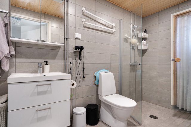 - WC-istuin, suihku, suihkuseinä, pesukoneliitäntä, pesuallas, allaskaappi, peilikaappi, lattialämmitys, ja bidee-suihku