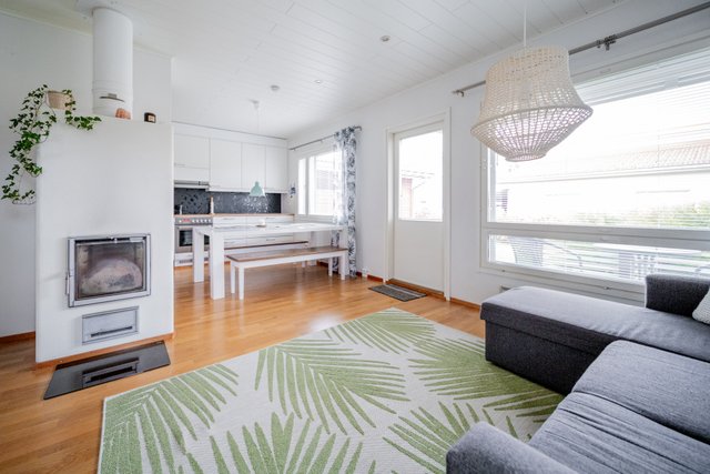 Oleskelutilan valkea takka luo kotiin lämpimän tunnelman. Olohuoneen ja keittiön välistä on uloskäynti suojaisalle, katetulle terassille. Arjen askareisiin käytännöllisyyttä tuo erillinen kodinhoitotila, jossa on kivasti säilytystilaa ja laskutasoa.