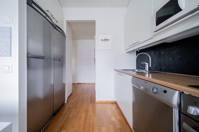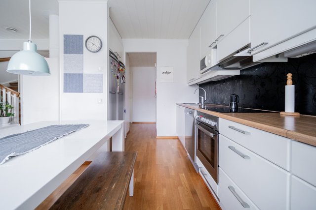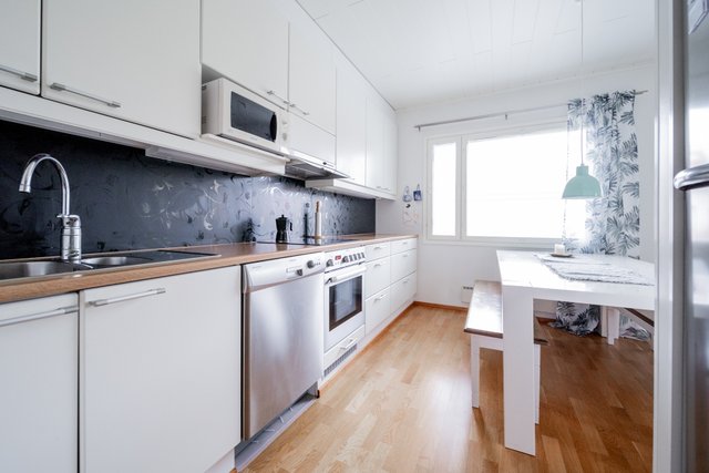- Valkeat ajattomat kalusteet. Täyskorkeat kylmäkoneet, astianpesukone, erillisuuni ja liesitaso. Ikkunan edessä tila ruokailuryhmälle. Yhteys oleskelutilaan.