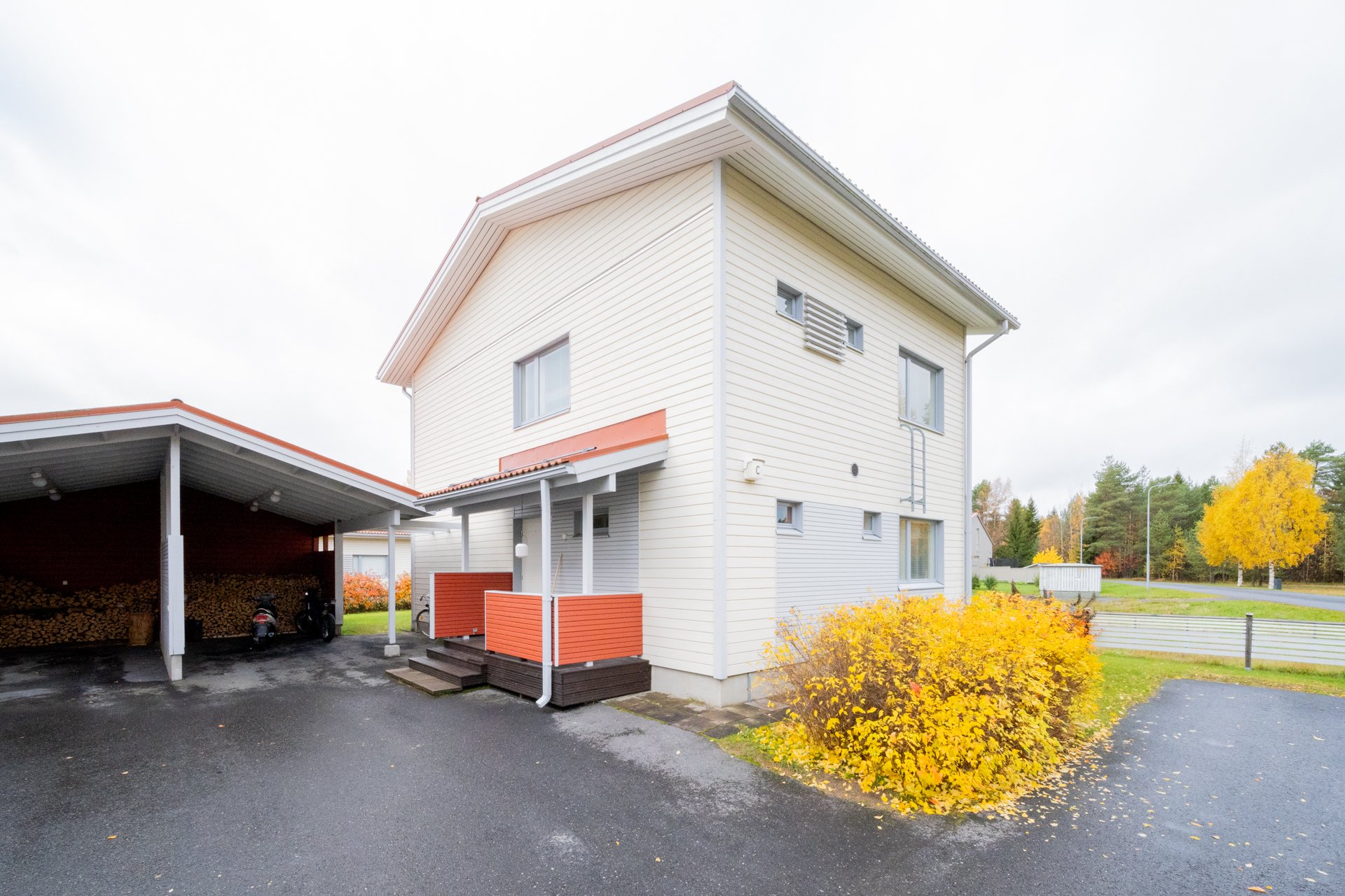 Autosi saat ajaa aivan kodin vieressä sijaitsevaan autokatokseen, jonka yhteydessä on oma ulkovarasto. Talon edustalla on tilaa myös toiselle autolle.