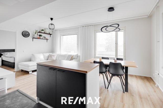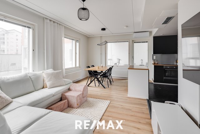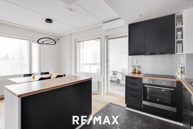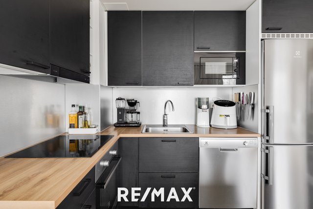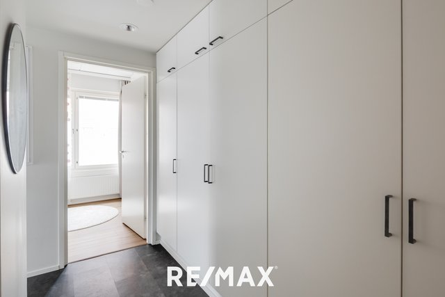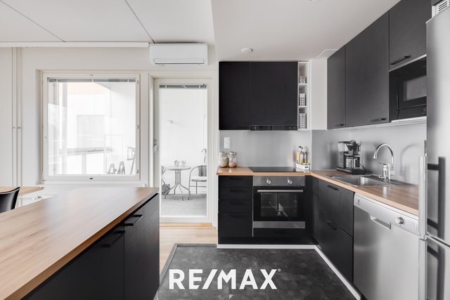 Keittiössä on laadukkaat kodinkoneet, kuten integroitu mikroaaltouuni ja astianpesukone, jotka tekevät arjesta sujuvaa. Kaksi makuuhuonetta tarjoavat riittävästi tilaa ja mukavuutta. Kylpyhuoneessa on kaikki tarvittava, kuten pesukoneliitäntä ja peilikaappi.