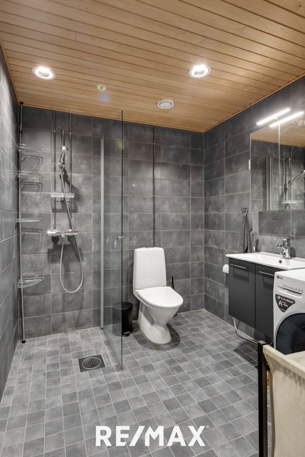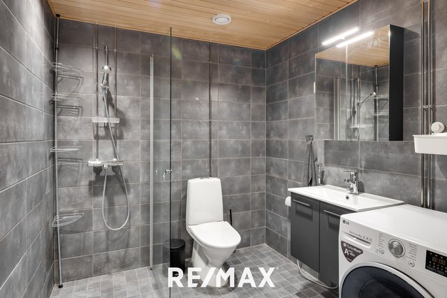 - WC-istuin, suihku, suihkuseinä, pesukoneliitäntä, pesuallas, allaskaappi, bidee-suihku, ja peilikaappi
