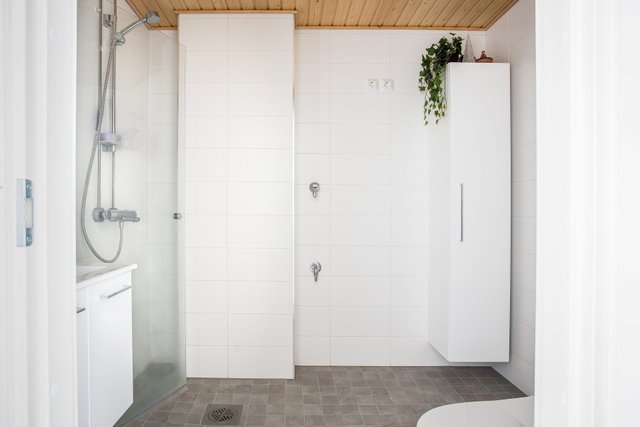 - WC-istuin, suihku, suihkuseinä, pesuallas, ja pesukoneliitäntä