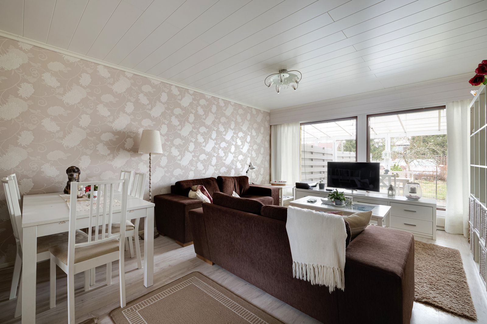 Pesuhuoneen yhteydessä kodinhoitotila, erillinen wc, tilava eteinen. Isosta olohuoneesta näkymä suojaisalle etuterassille.