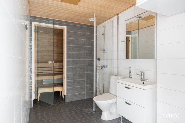 - WC-istuin, suihku, lattialämmitys, bidee-suihku, allaskaappi, pesuallas, peilikaappi, ja pesukoneliitäntä
