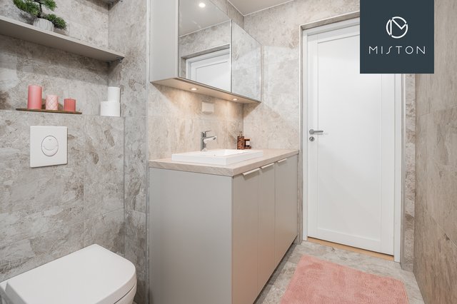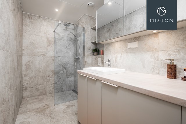 - Suihkuseinä, suihku, pesuallas, allaskaappi, ja pesukoneliitäntä