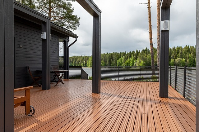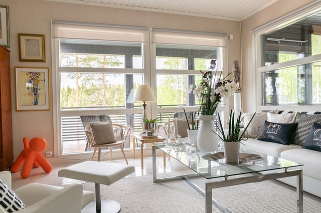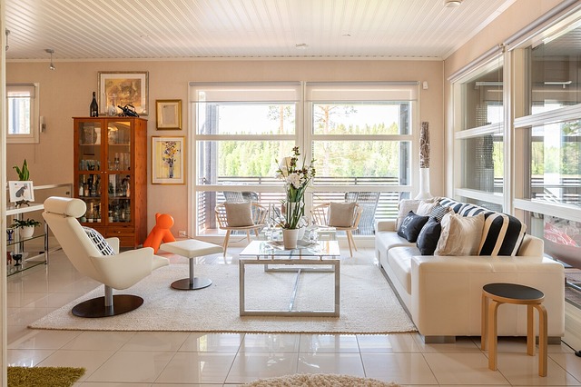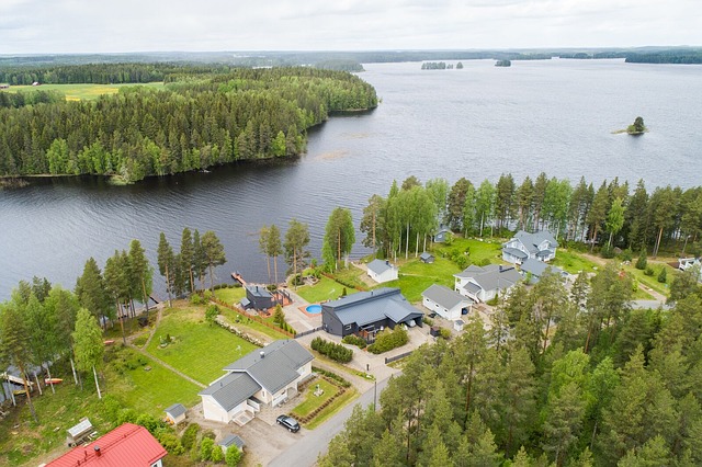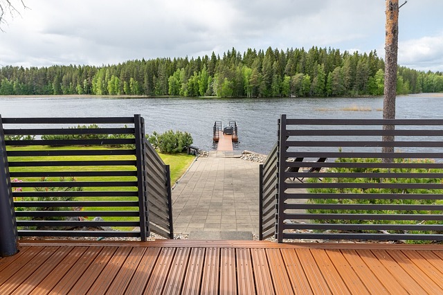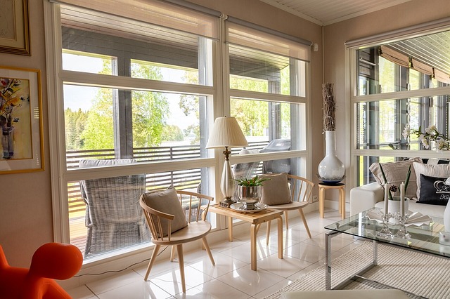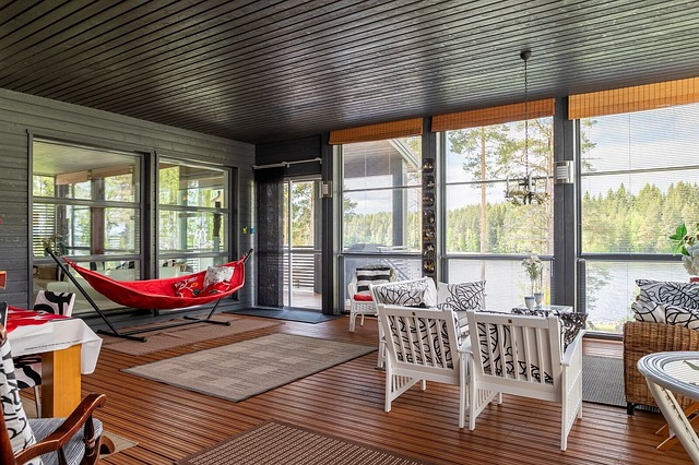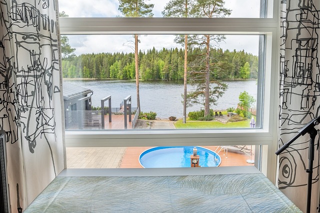 - - vaalea suurikokoinen lattialaatta - suuret ikkunapinnat upeilla järvimaisemilla