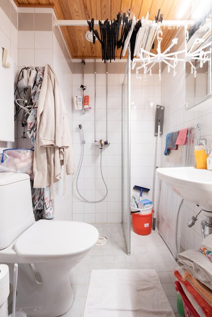 - WC-istuin, suihku, pesukoneliitäntä, lattialämmitys, peili, allaskaappi, ja bidee-suihku