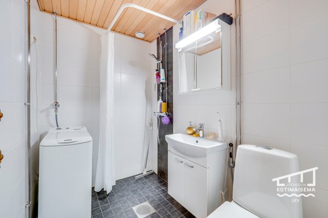 - WC-istuin, pesukoneliitäntä, peilikaappi, allaskaappi, ja suihku