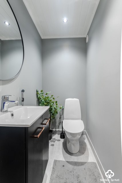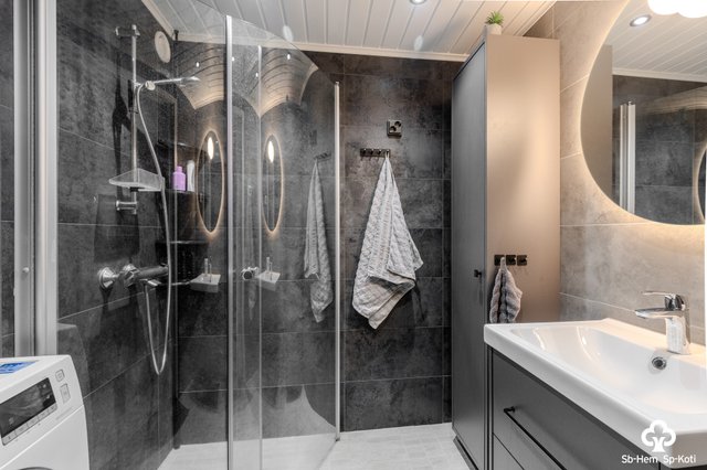 - WC-istuin, peilikaappi, suihkuseinä, suihku, pesukoneliitäntä, ja lattialämmitys