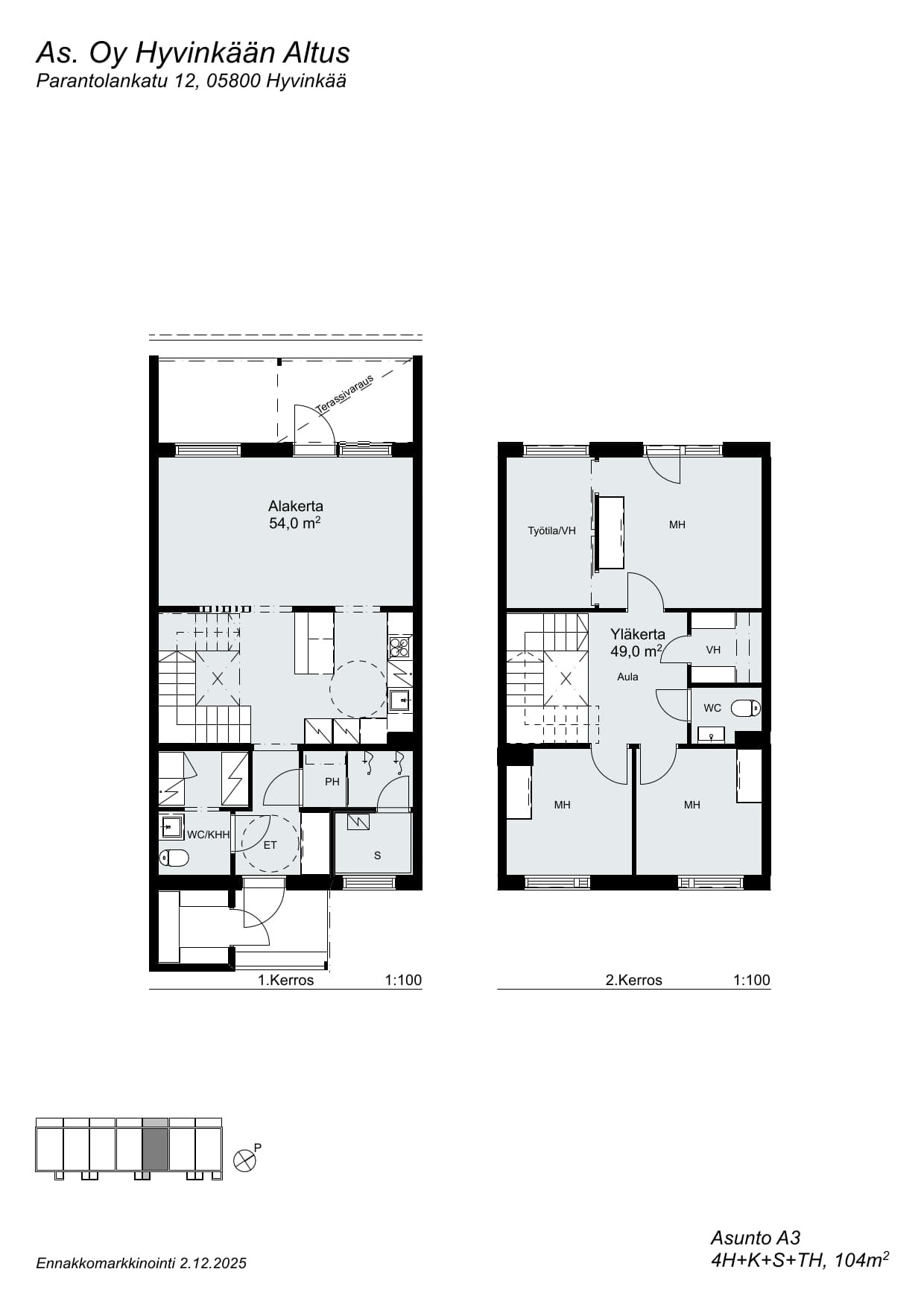 - Pinta-ala on yhtiöjärjestyksen mukaan 105 m², pohjapiirustuksen mukaan 104 m². Pinta-ala tarkentuu myöhemmin.