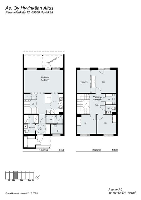- Pinta-ala on yhtiöjärjestyksen mukaan 105 m², pohjapiirustuksen mukaan 104 m². Pinta-ala tarkentuu myöhemmin.