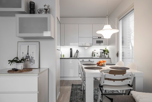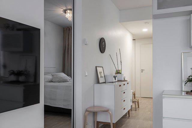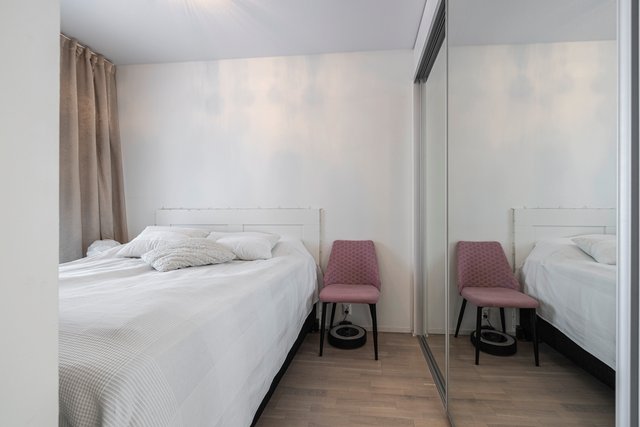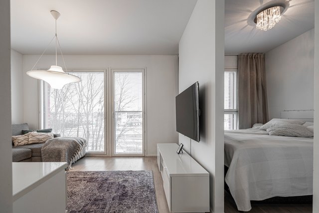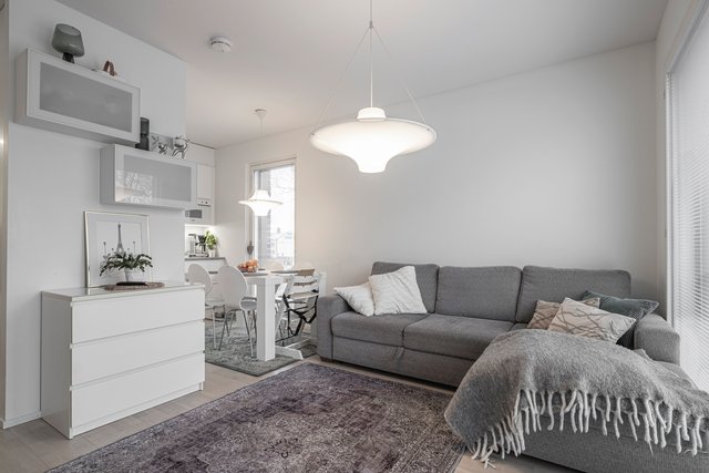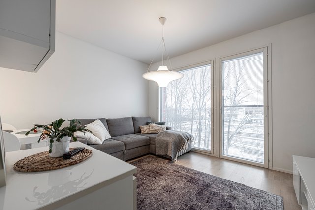 Asunnon pohjaratkaisu on suunniteltu huolella, ja se tarjoaa kaksi makuuhuonetta, avaran olohuoneen sekä tyylikkään keittiön, jossa on laadukkaat kodinkoneet, kuten induktioliesi ja astianpesukone. Kylpyhuone on varustettu lattialämmityksellä ja saunassa voi rentoutua sähkökiukaan lämmössä.