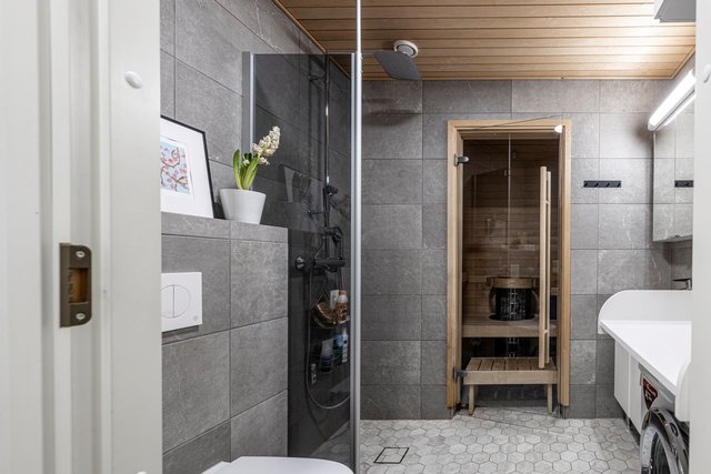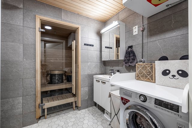 - WC-istuin, suihku, suihkuseinä, pesukoneliitäntä, pesuallas, allaskaappi, peilikaappi, lattialämmitys, ja bidee-suihku
