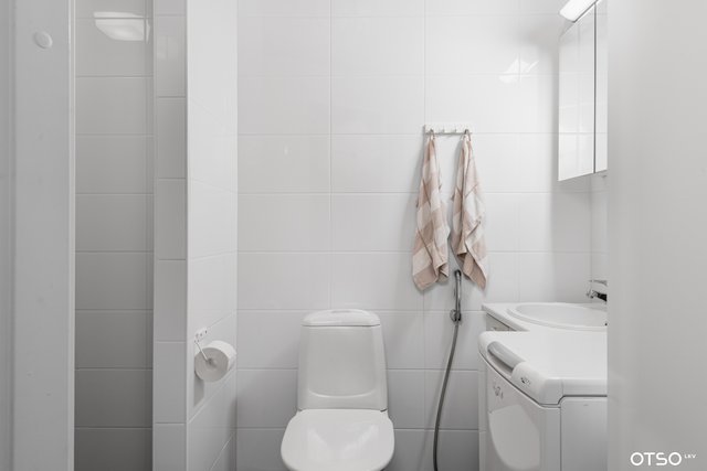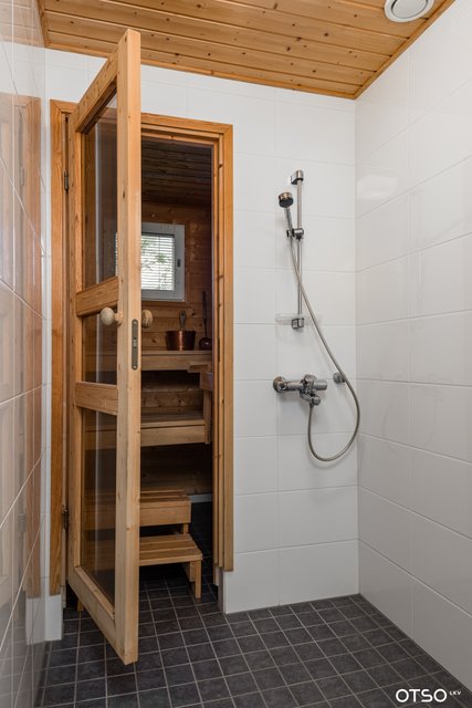 - WC-istuin, suihku, pesukoneliitäntä, lattialämmitys, allaskaappi, peilikaappi, ja pesuallas