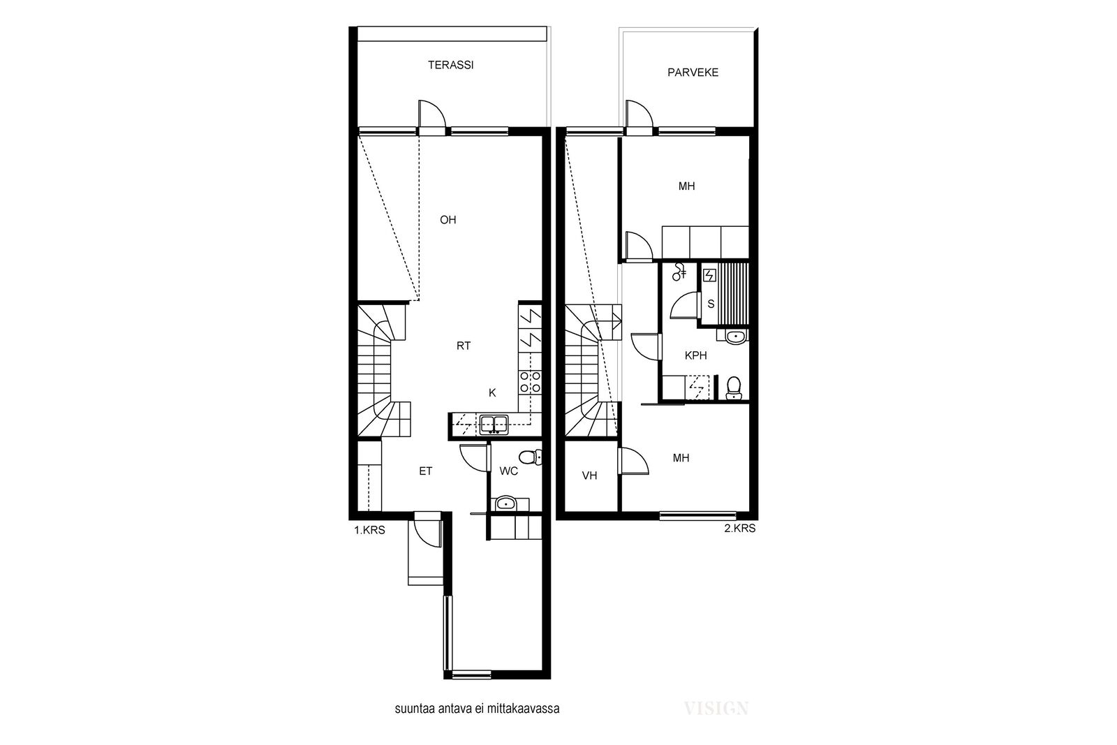 Asunnon alakerrasta löytyvät viihtyisä olohuone ja keittiö, yhteistä avaraa tilaa. Yläkerrassa sijaitsevat asunnon kaksi makuuhuonetta ja sauna, jotka tarjoavat omaa rauhaa ja tilaa perheen arkeen. Olohuoneesta on käynti suojaisalle ja helppohoitoiselle pihalle, joka kutsuu viettämään aikaa ulkona keväästä syksyyn.