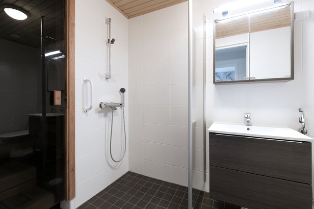 - Pesukoneliitäntä, wc-istuin, suihku, suihkuseinä, peilikaappi, pesuallas, allaskaappi, ja bidee-suihku
