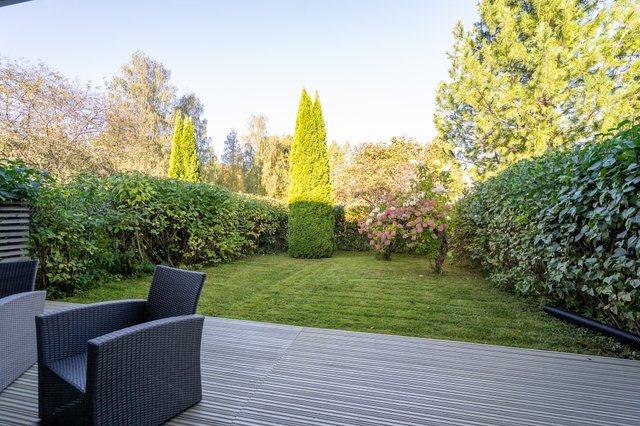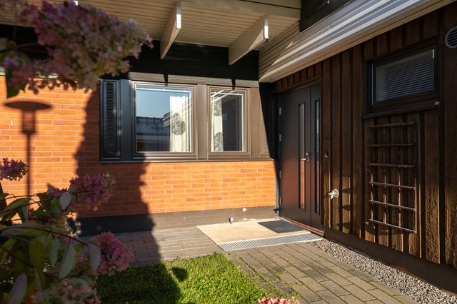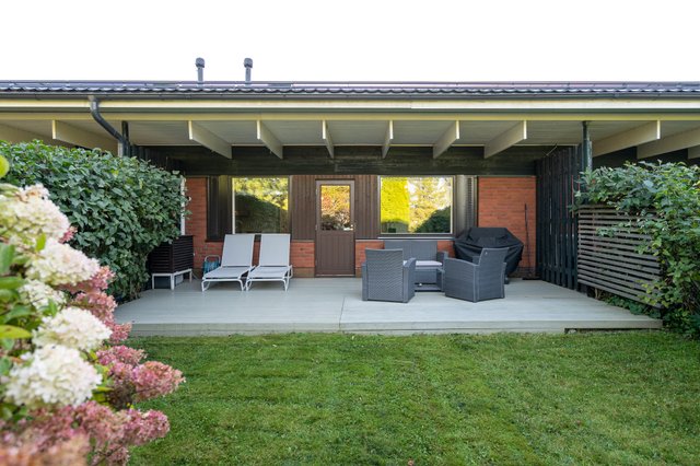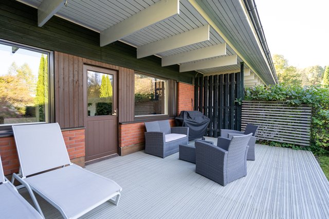 - Takapihan puolella osittain katettu terassi (tehty 2015) n. luoteeseen, jota laajennettu 2021.