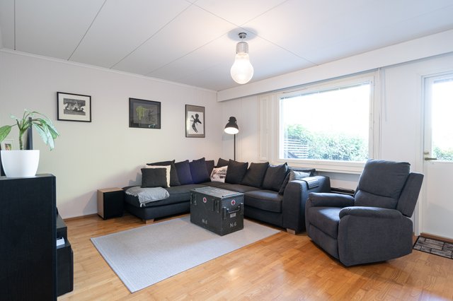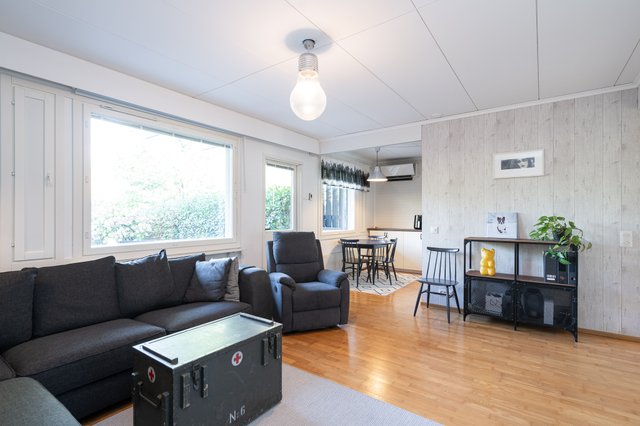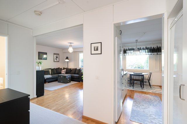 Loppu asunto aukeaa tuulikaapista vasemmalle kääntyessä. Eteiskäytävän varrella on oikealla puolella vaatehuone ja vuonna 2014 remontoitu wc, vasemmalla puolella on taas toinen makuuhuoneista. Asunnon perällä on vuonna 2013 remontoitu i-mallinen keittiö sekä ruokailutila, joka aukeaa tilavaan olohuoneeseen. Ruokailutilassa on vuonna 2010 asennettu ilmalämpöpumppu. Keittiön kaapistoja on jatkettu remontissa ikkunaseinälle asti, joten kaappitilaa on runsaasti. Olohuoneen ja ruokailutilan välistä on kulku vuonna 2015 uusitulle ja jatketulle terassille sekä ihanan isolle suojaisalle takapihalle, joka rajoittuu puistoalueeseen. Takapihalle paistaa aurinko iltapäivästä ihan iltaan asti, joten olohuone ja keittiökin ovat ihanan valoisia. Olohuoneen yhteydestä pääsee myös asunnon isompaan makuuhuoneeseen, jossa on tilava liukuovikaapisto.