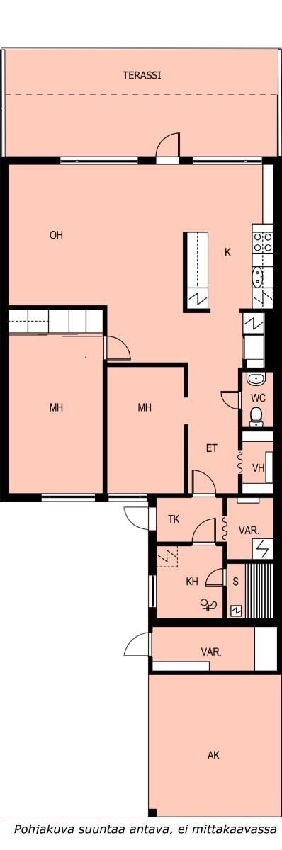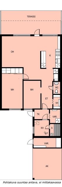 - Olohuone, keittiö ja takapiha n. luoteeseen, makuuhuoneet ja etupiha n. kaakkoon.